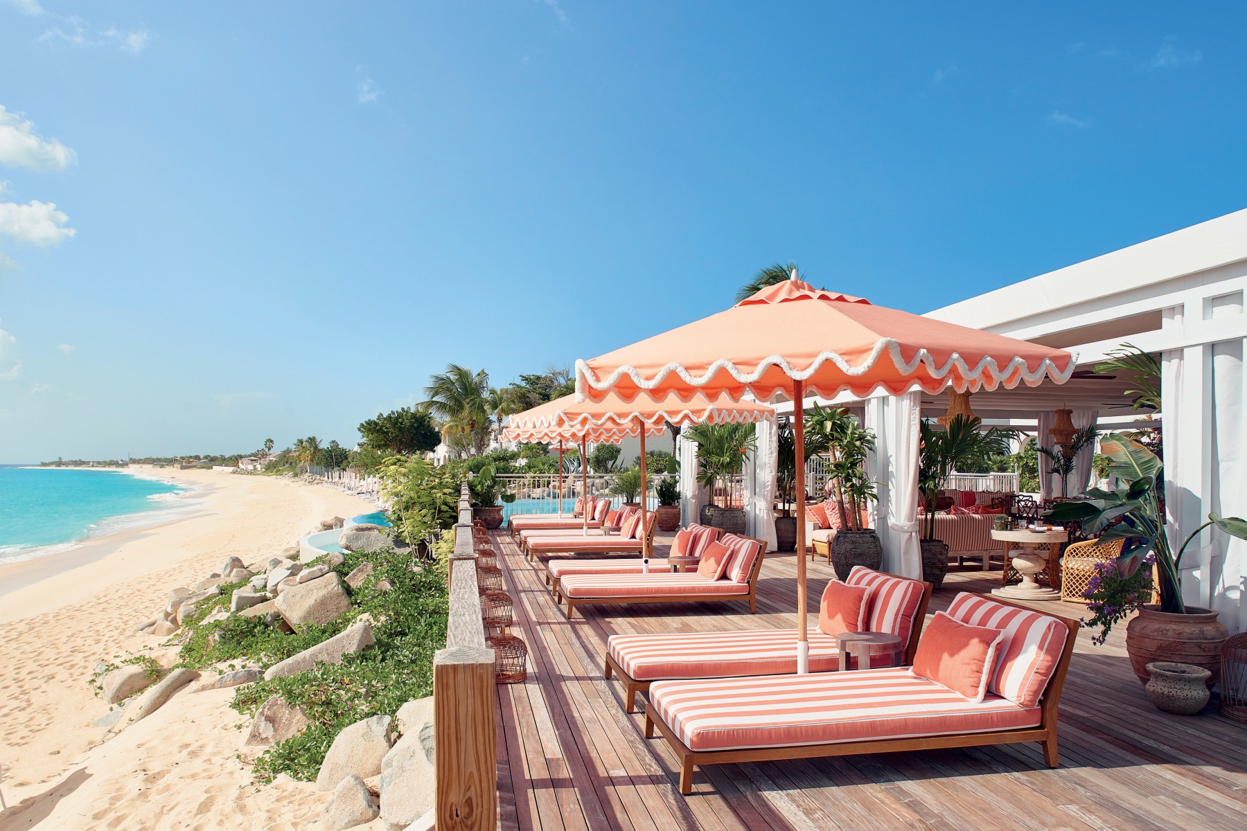 Des bâtiments blanchis à la chaux dans un écrin de végétation tropicale et bordés d'une plage de sable fin et blanc. L'hôtel dispose de 83 logements répartis entre la structure principale et les maisonnettes en bord de plage. Mais aussi 8 villas avec piscine privée. 2 piscines, 3 restaurants, bars, cave à vin, Spa, boutiques.